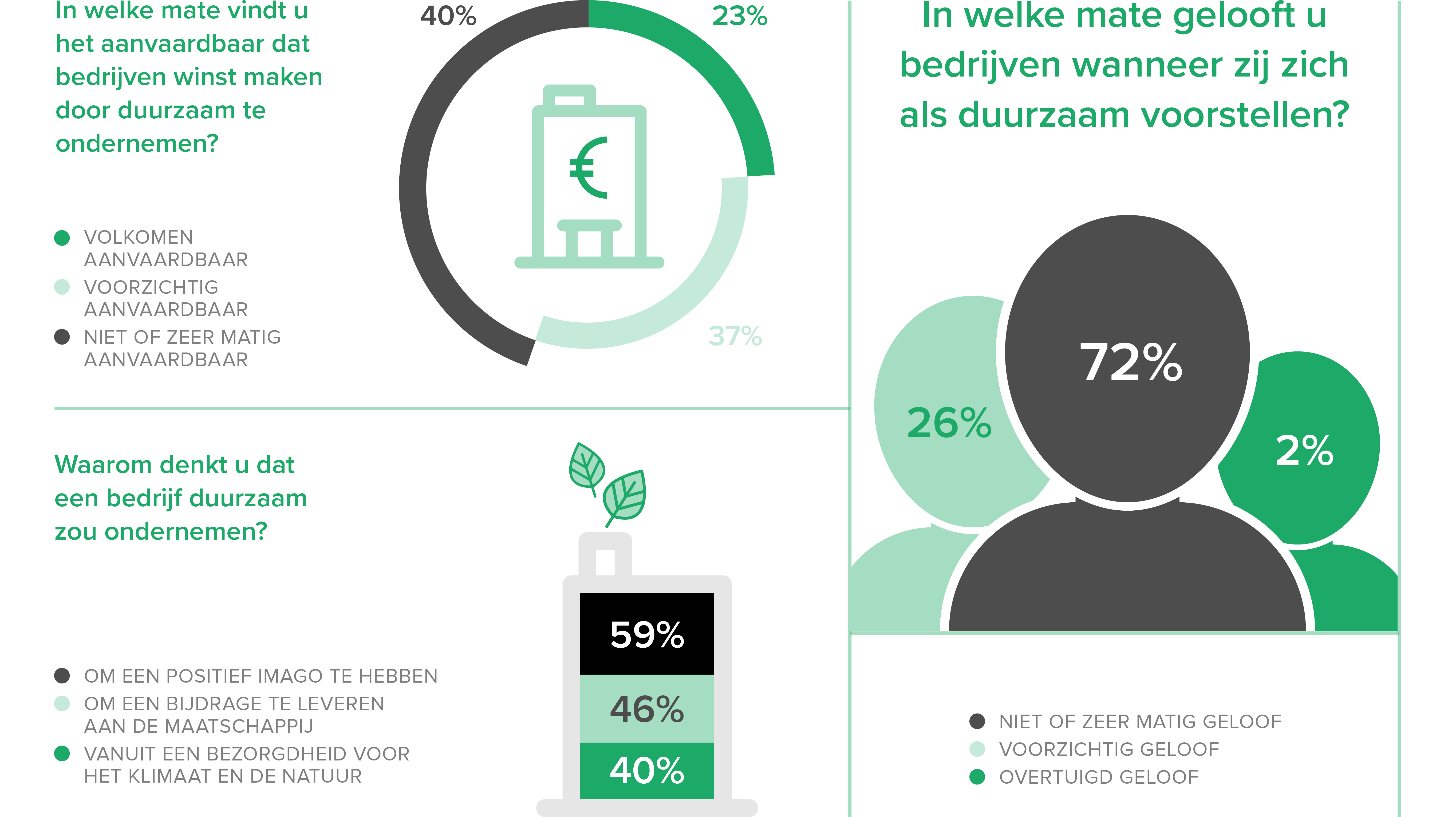 Het geloof in bedrijven of organisaties die zich als duurzaam voorstellen is laag (72% geeft een score tussen 0 en 6). Bovendien gelooft een meerderheid van de Vlamingen (59%) dat bedrijven vooral duurzaam ondernemen om een positief imago te hebben. Pas op de tweede plaats wordt geloofd dat bedrijven het doen om een positieve bijdrage te leveren aan de samenleving (46%) of vanuit een bezorgdheid voor het klimaat (40%) of de toekomst (39%).