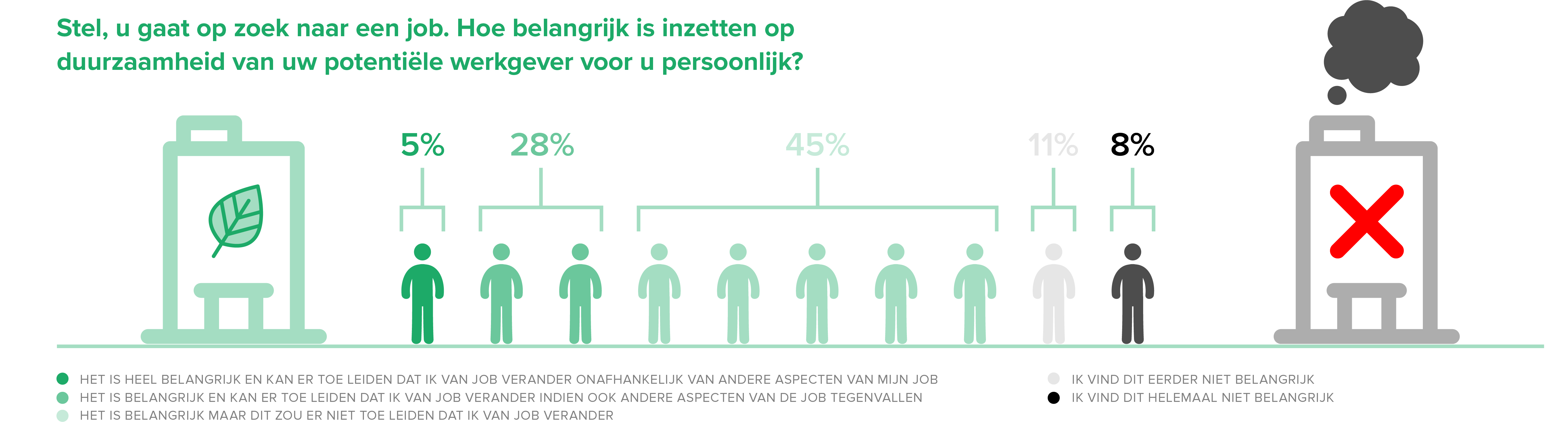 Slechts 17% van de Vlaamse werknemers vindt het persoonlijk niet belangrijk dat zijn werkgever inzet op duurzaamheid. 29% vind het belangrijk genoeg dat het eventueel zou kunnen leiden tot veranderen van job.